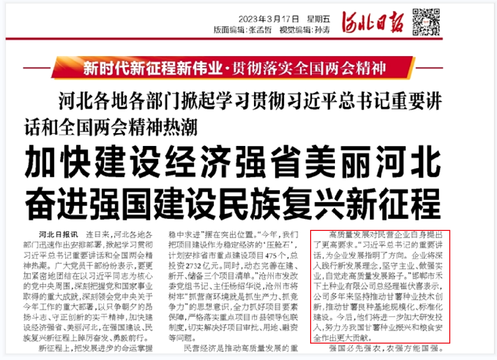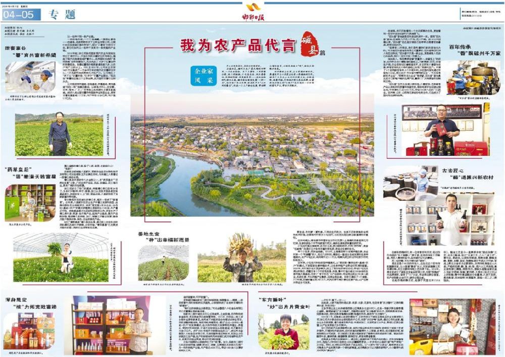 2023年7月18日,《農(nóng)民日?qǐng)?bào)》刊登“河北磁縣:‘四個(gè)一萬(wàn)畝’推進(jìn)特色農(nóng)業(yè)發(fā)展”,關(guān)注磁縣脫毒甘薯等4大特色農(nóng)業(yè)產(chǎn)業(yè)高質(zhì)量發(fā)展。
