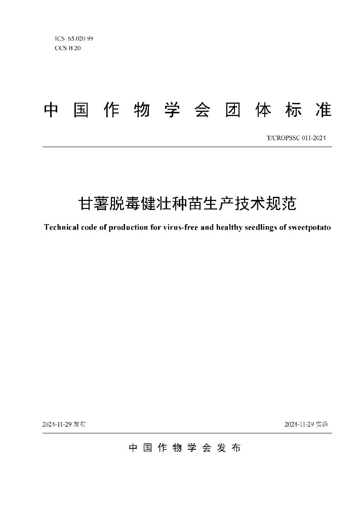 為加快推動(dòng)甘薯脫毒健壯種苗生產(chǎn)技術(shù)規(guī)范化,促進(jìn)我國(guó)甘薯產(chǎn)業(yè)的高質(zhì)量發(fā)展,中國(guó)作物學(xué)會(huì)甘薯專(zhuān)業(yè)委員會(huì)、江蘇徐淮地區(qū)徐州農(nóng)業(yè)科學(xué)研究所、邯鄲市禾下土種業(yè)有限公司共同起草的《甘薯脫毒健壯種苗生產(chǎn)技術(shù)規(guī)范》團(tuán)體標(biāo)準(zhǔn)正式對(duì)外公布。全文如下