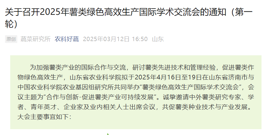 為加強(qiáng)薯類(lèi)產(chǎn)業(yè)的國(guó)際合作與交流,研討薯類(lèi)先進(jìn)技術(shù)和管理經(jīng)驗(yàn),促進(jìn)薯類(lèi)作物綠色高效生產(chǎn),山東省農(nóng)業(yè)科學(xué)院擬于2025年4月16日至19日在山東省濟(jì)南市與中國(guó)農(nóng)業(yè)科學(xué)院農(nóng)業(yè)基因組研究所共同舉辦“薯類(lèi)綠色高效生產(chǎn)國(guó)際學(xué)術(shù)交流會(huì)”。會(huì)議以“合作與創(chuàng)新-促進(jìn)薯類(lèi)產(chǎn)業(yè)可持續(xù)發(fā)展”為主題,將邀請(qǐng)國(guó)內(nèi)外從事薯類(lèi)研究的院士、體系首席、專(zhuān)家、重點(diǎn)企業(yè)負(fù)責(zé)人及其他相關(guān)人士;山東省人民政府、科學(xué)技術(shù)廳、農(nóng)業(yè)農(nóng)村廳等相關(guān)部門(mén)領(lǐng)導(dǎo)出席。圍繞全球雜交馬鈴薯聯(lián)盟(GHPA)專(zhuān)題研討、馬鈴薯綠色高效生產(chǎn)、甘薯綠色高效生產(chǎn)等三大主要議題開(kāi)展交流研討,共促薯類(lèi)種業(yè)技術(shù)與產(chǎn)業(yè)發(fā)展。會(huì)議時(shí)間:2025年4月16日-19日4月16日:全天報(bào)到4月17-18日:開(kāi)幕式、專(zhuān)家報(bào)告4月18日下午:前往觀摩現(xiàn)場(chǎng)4月19日上午:觀摩滕州馬鈴薯、泗水甘薯生產(chǎn)基地4月19...