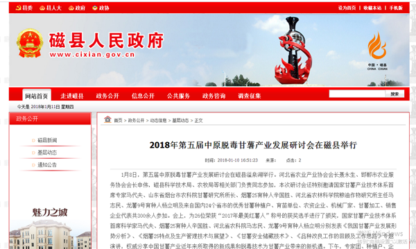 2018年1月8日,第五屆中原脫毒甘薯產(chǎn)業(yè)發(fā)展研討會在河北磁縣溢泉湖隆重舉行。得到各大報紙、網(wǎng)絡(luò)媒體的關(guān)注。