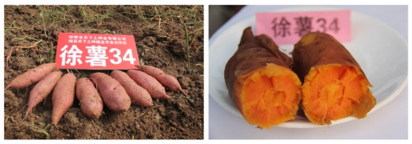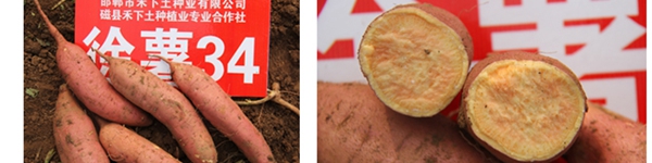 該品種赭紅皮桔紅肉,長紡錘形,蒸煮、生食口感好,許多地方已進行精包裝進超市,市民也把它作為一種禮品贈送親朋好友。徐薯34比一般的甘薯品種早熟20~30天,能早收早上市,彌補市場空缺,經濟效益高,特別適宜城郊地區(qū)發(fā)展。