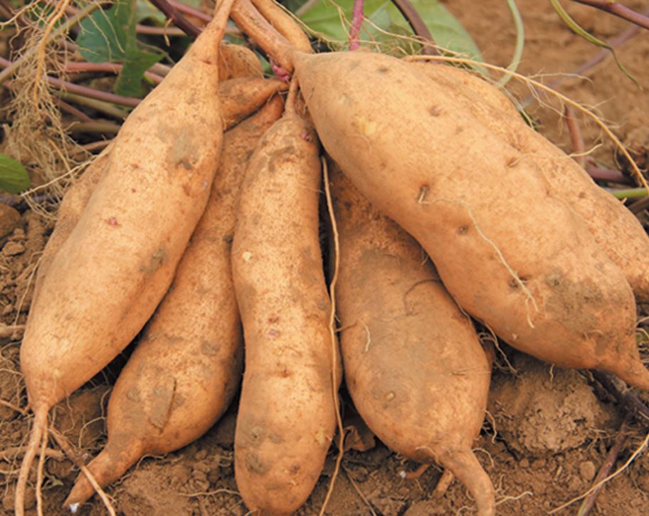黃金玉1號特征特性:該品系株型半直立,中蔓,單株分枝10條左右,頂葉紫色,葉形心臟形,葉脈綠色,葉柄綠色,柄基綠色,蔓綠色,蔓粗中等,單株結(jié)薯5個(gè)左右,薯形下紡錘形,薯塊光滑美觀,薯皮淡紅色,肉色淡黃色,干物率27.9%,出粉率18%,食味品質(zhì)優(yōu)于金山57,田間表現(xiàn)有較強(qiáng)的抗病性。發(fā)芽早,出苗多,長苗快。大田莖葉生長表現(xiàn)快速,封壟早。耐濕、耐旱瘠。產(chǎn)量表現(xiàn):2018年參加新品系比較試驗(yàn),春薯:鮮薯畝產(chǎn)5327.5公斤,比對照比對照"金山57"(下同)增產(chǎn)32.6%;薯干畝產(chǎn)1480.5公斤,比對照增產(chǎn)45.6%。秋薯:鮮薯畝產(chǎn)4231公斤,比對照比對照增產(chǎn)49.4%;薯干畝產(chǎn)1480.5公斤,比對照增產(chǎn)64.58%。栽培技術(shù)要點(diǎn):⑴適時(shí)早插,合理密植,畝插4000—4500株為宜。⑵施足基肥,早施追苗肥,后期看莖葉生長情況酌情追施磷鉀...